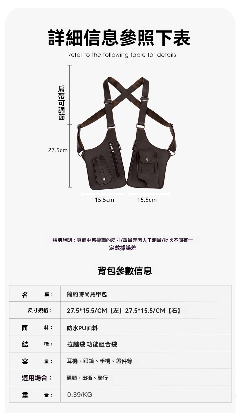 25分鐘前戰術復古 - 多功能皮革防盜馬甲背帶腋下挎包(帶拉鏈) - 3入組=NT$1999